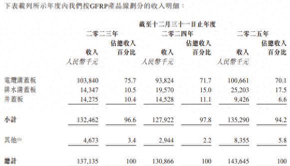 而该公司的GFRP沟盖板产品可按关键加工工序进一步分类,即BMC及SMC,BMC与SMC均属热固性复合材料,相比于SMC,BMC主要成特点为成本较低,实现成本和性能的均衡,因此一直都为公司核心,占比收入常年超过90%。2025年BMC及SMC收入贡献分别为93.2%及5.8%。